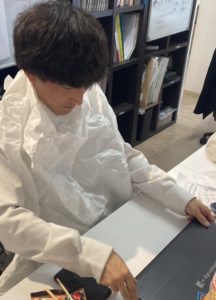 段ボールに養生のために入っていたやたら大きな紙をきれいに前掛けにして