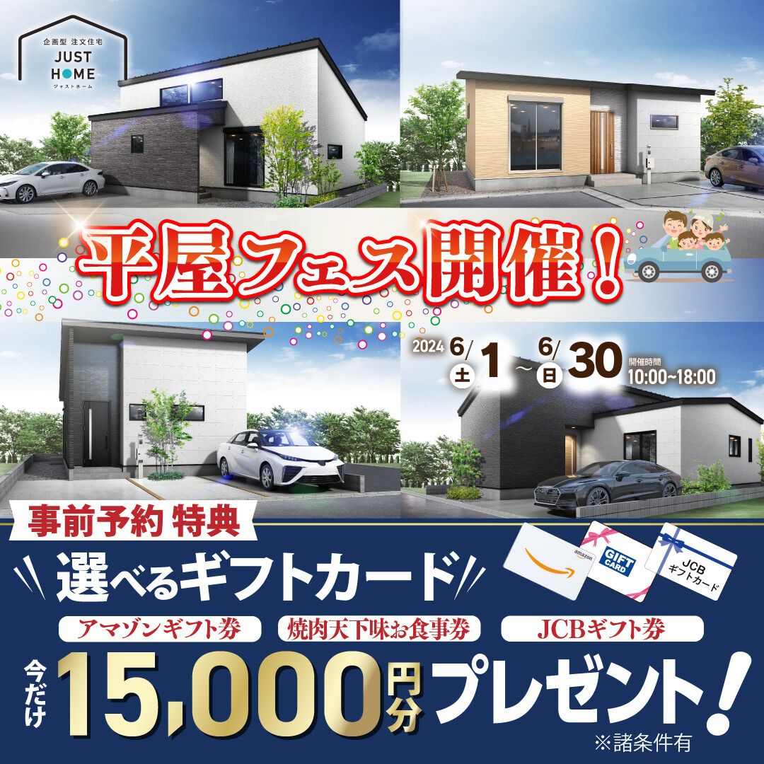 【ご来場プレゼント進呈条件】①弊社施工可能エリアにて前向きにお家づくりを検討されていると弊社スタッフが判断した方。 ②はじめてジャストホームのイベントおよび店舗へご来場される方。 ③20歳以上の方。 ④ 施工可能エリア外での建築予定の方の来場特典は進呈いたしかねますのでご了承ください。 ⑤ご来場プレゼントは、次回ご来場時のお渡しとなります。