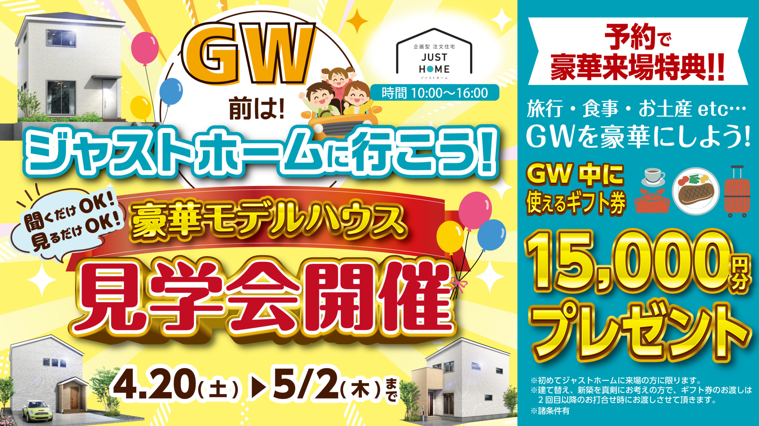【ご来場プレゼント進呈条件】①弊社施工可能エリアにて前向きにお家づくりを検討されていると弊社スタッフが判断した方。 ②はじめてジャストホームのイベントおよび店舗へご来場される方。 ③20歳以上の方。 ④ 施工可能エリア外での建築予定の方の来場特典は進呈いたしかねますのでご了承ください。