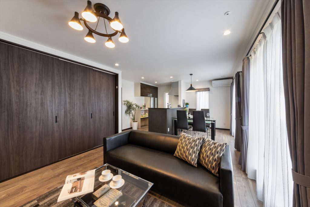 LDKはシンプルながらも温かみがあり、家族みんなの憩いのスペースになるように。外観のデザインに合わせてクロスやインテリア、カーテンも大人シックな印象に仕上げました。