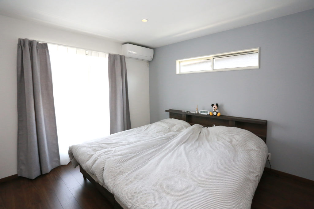 一面をグレーの壁紙にすることで、空間にメリハリが生まれた主寝室